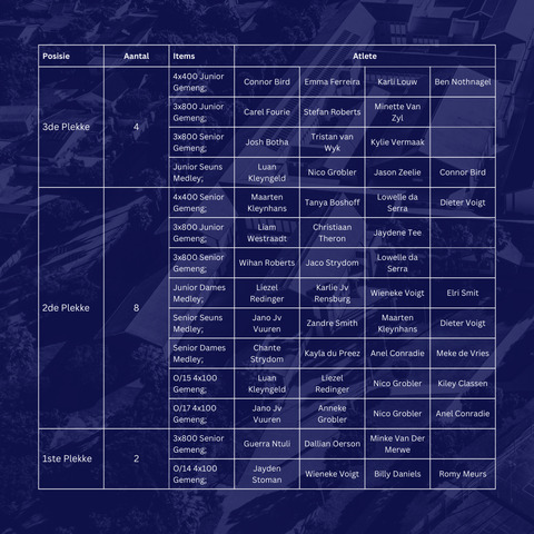 Goud: Chané Petzer (1500m:do/17), Vicky Oelofse (1500m: do/15) en Abigal Appelgryn (Hoogspring:do/15)
